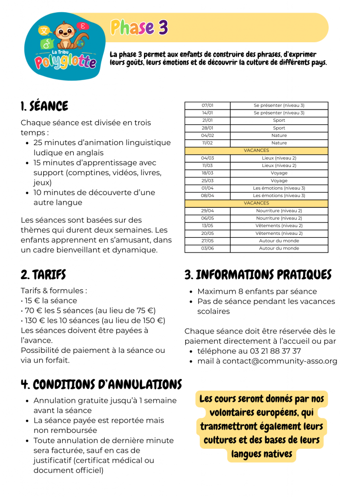 Pour que l’accompagnement reste de qualitĂ©, nous accueillons au maximum 8 enfants par sĂ©ance. Le parcours est adaptĂ© au rythme de chacun grâce Ă trois groupes de niveaux (Phases 1, 2 et 3), avec un petit test initial pour s’assurer que votre enfant soit dans le bon groupe. C’est une approche ludique avant tout : pas de bureaux figĂ©s, mais des animations, des supports variĂ©s comme des vidĂ©os ou des BD, et mĂŞme une initiation aux langues de nos volontaires.